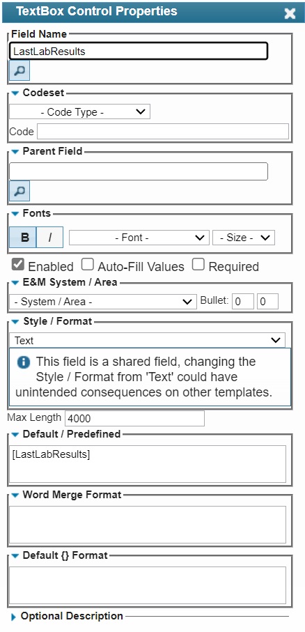 In the default / predefined you can see I put in [LastLabResults]. In another area in the medical record backend, I have defined what those results are and will be automatically pulled into the note in that section.