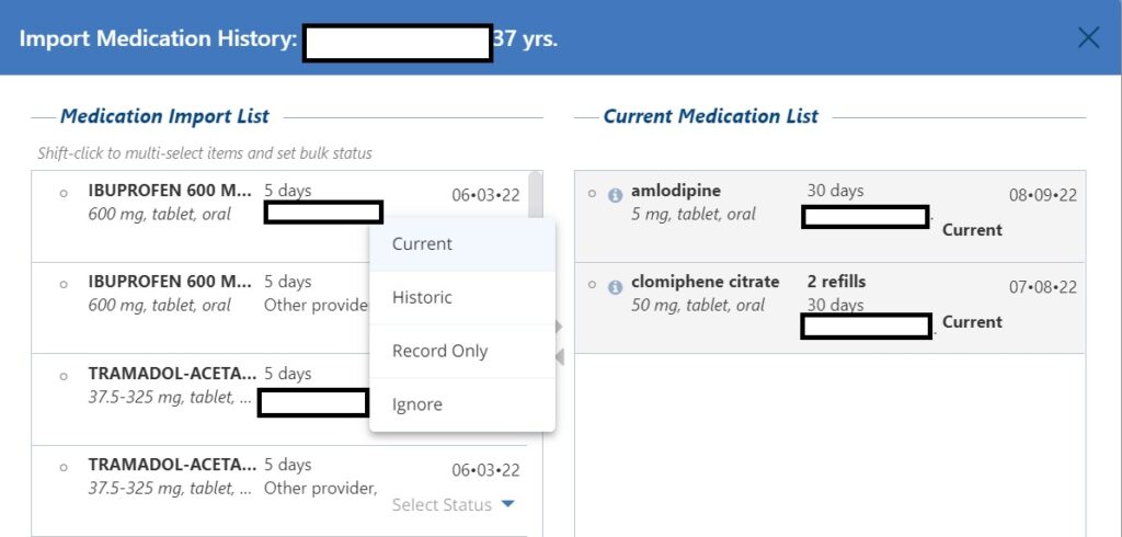 Let’s say you pull in a medication into a patients chart from this automated pharmacy check (see screen below). What is nice is that you can pull a list from their pharmacy and mark it as current, historic, record only, or ignore it.