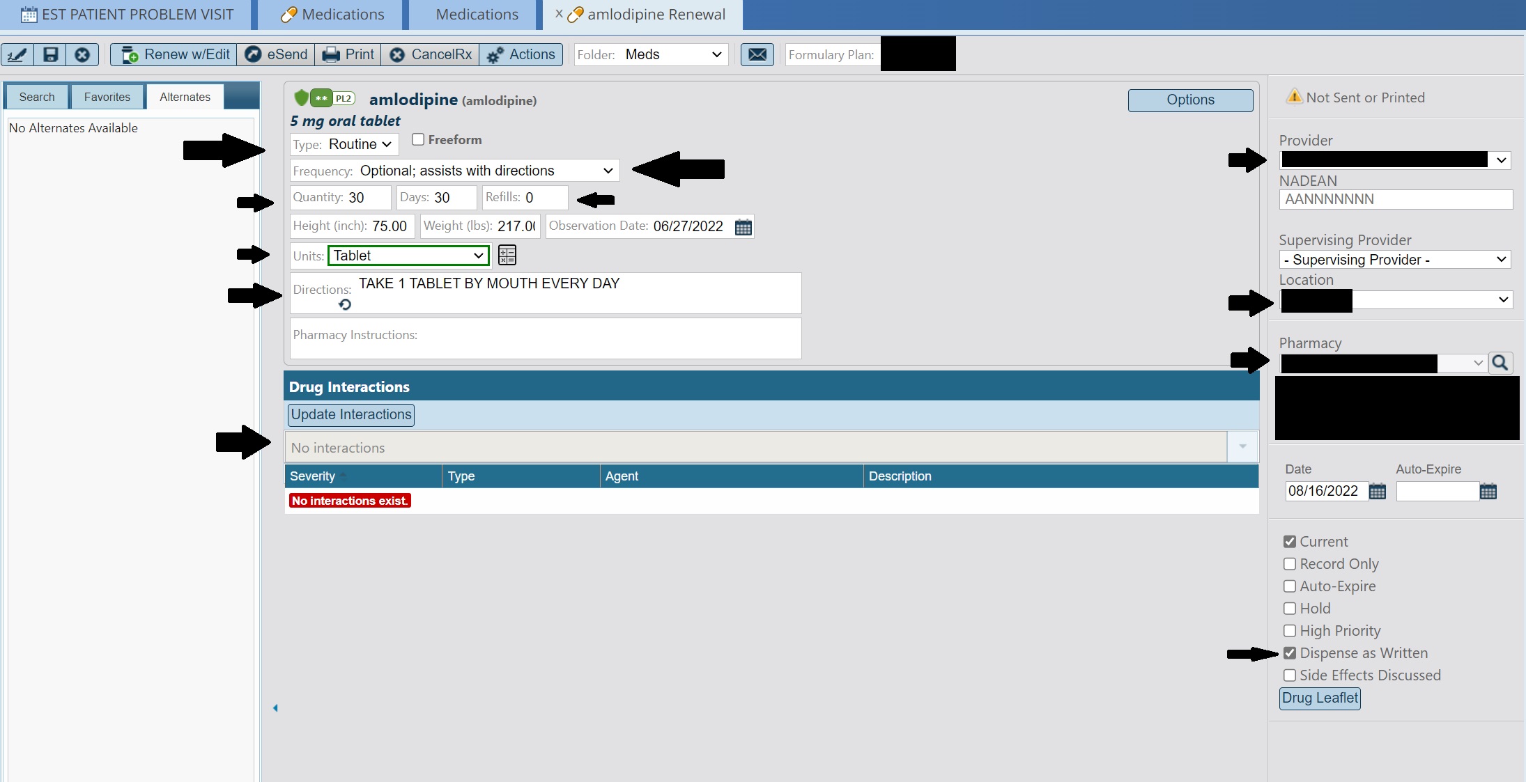 6. Click drug interactions to acknowledge them. 90% of prescriptions have them since drug alerts are super high in this EMR. For example, Losartan will give a flag about checking kidney function.
