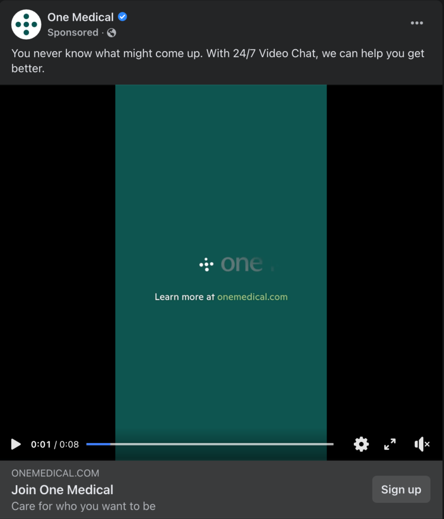 I logged in at the time of writing this post, scrolled down and the 4th post on Facebook was an advertisement, and it was One Medical. Here is a screenshot of their advertisements.