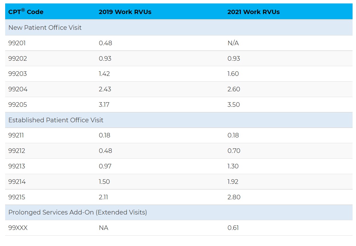 RVU values in 2021 were altered. Outpatient new office visits and follow up visits saw their values increased.