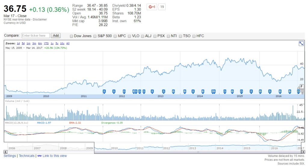 I interviewed in 2008 at the Paul Foster School Of Medicine and I remember hearing about how Mr. Foster donated a lot of money for the medical school. I “Googled” his name, found that he was head of an oil refinery called Western Refining and owned a lot of shares of this company. This was also around the same time my brother was establishing an oil and gas company in Houston. He loved the industry and kept talking about how he felt oil and gas stocks as a whole were undervalued. He forbid me from buying any shares of his company when it went public, so I bought Western Refining stock instead. I knew very little about the stock other than the CEO has a large personal stake in the company doing well since he personally owned a lot of shares.