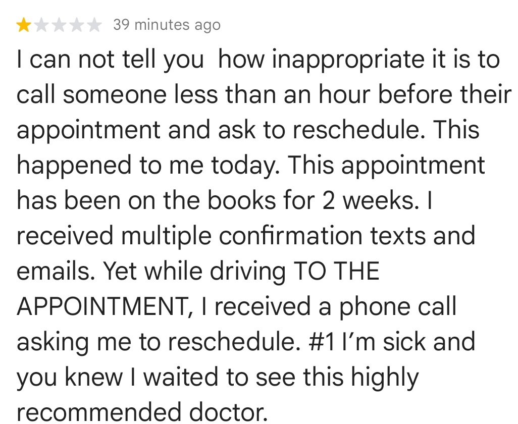 My next patient was something similar. They left me a 1-star review because I did not give them 24 hours heads up for canceling their office visit. They cussed at my staff while we tried to explain to them that it was a medical emergency and hung up on my staff before they could explain.